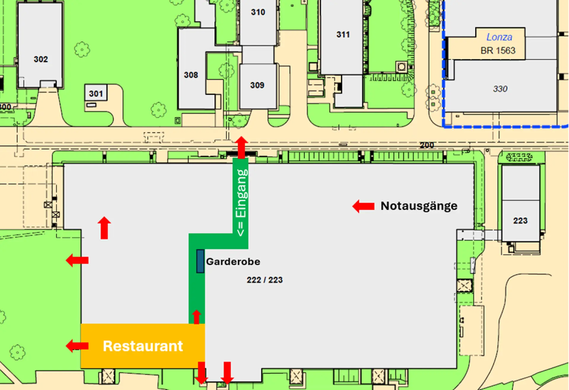 - Die Fluchtwege sind signalisiert. Bitte machen Sie sich bei Eintritt ins Gebäude mit den Fluchtwegen vertraut.